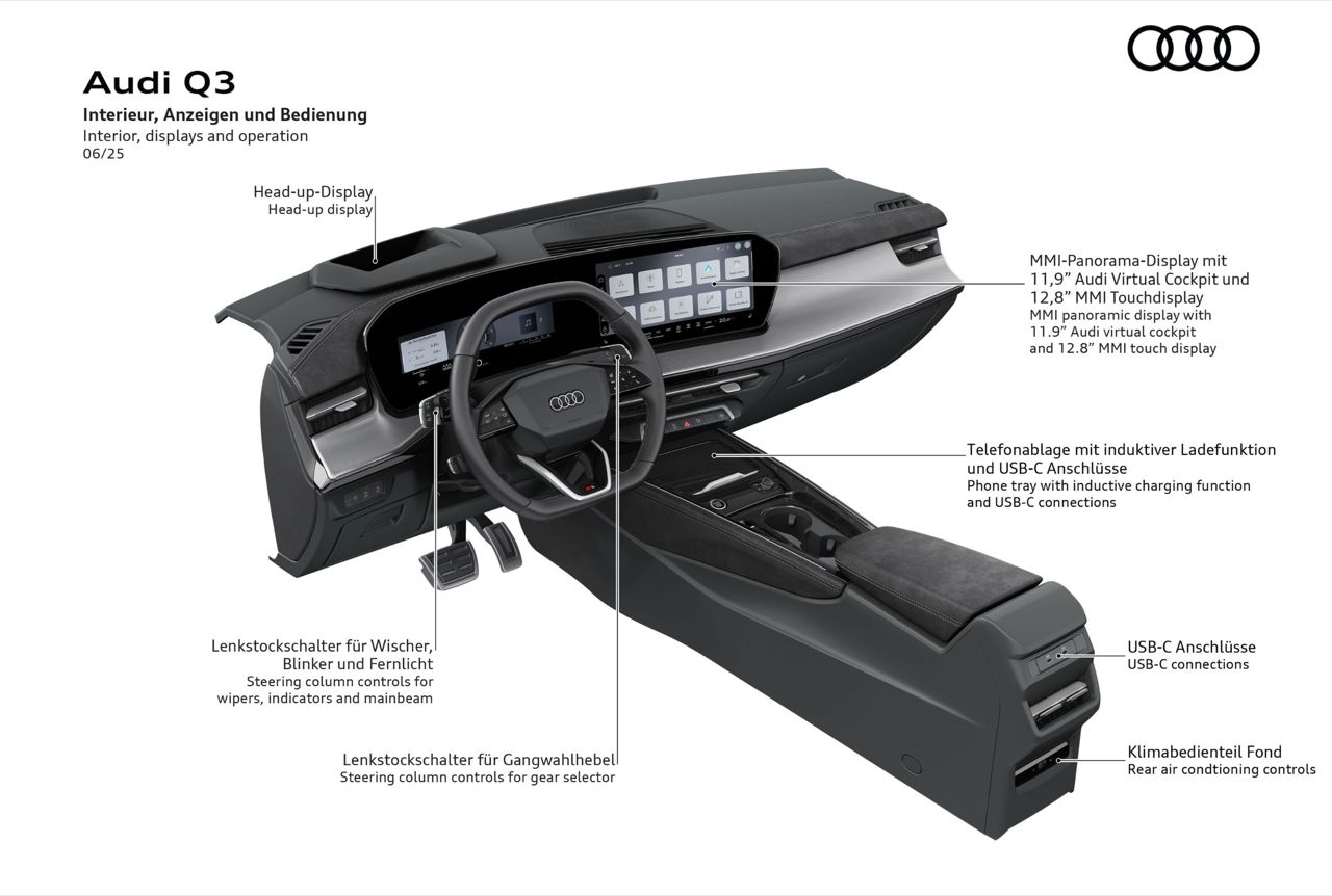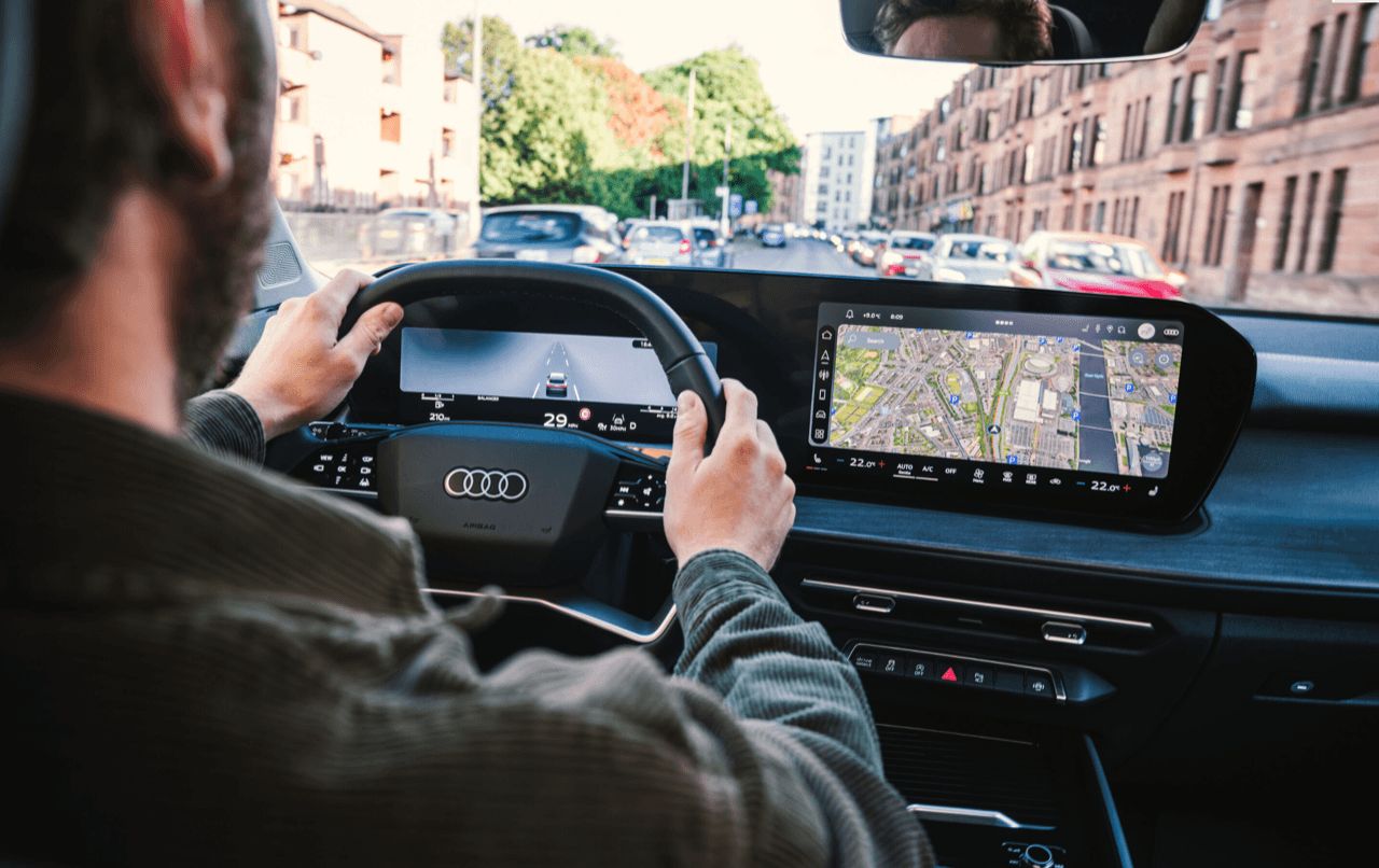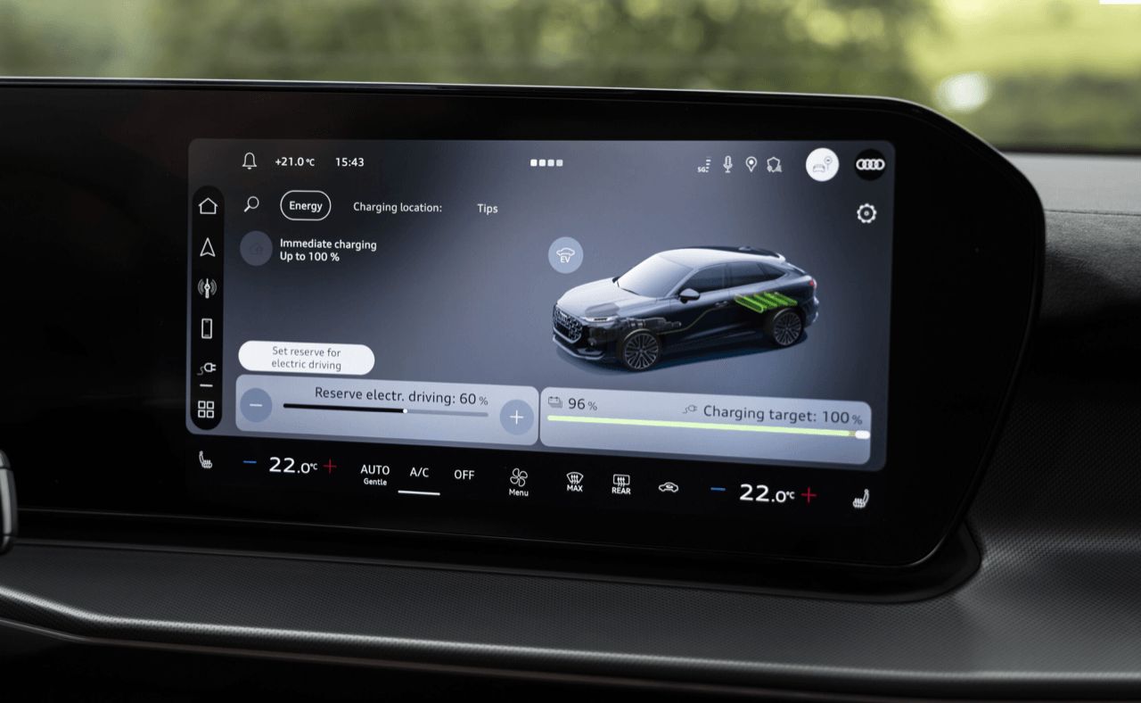 หน้าจอคู่แบบโค้ง ประกอบด้วย จอมาตรวัดดิจิทัล 11.9 นิ้ว (Virtual Cockpit) และจอกลาง MMI Touch Display ขนาด 12.8 นิ้ว ระบบปฏิบัติการใช้ Android Automotive OS รองรับการลงแอปพลิเคชันจาก Third-party เช่น YouTube และมีระบบสั่งการด้วยเสียง AI-enhanced voice recognition ระบบเสียง ออปชันพรีเมียมจาก Sonos 12 ลำโพง กำลังขับ 420 วัตต์
