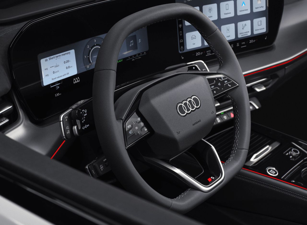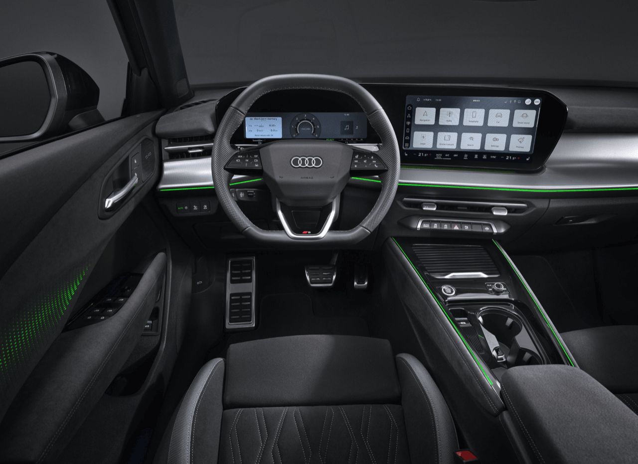 ระบบอินโฟเทนเมนท์ (Infotainment) ภายในห้องโดยสารใช้แนวคิด "Digital Stage" ที่ล้ำสมัย จอแสดงผลพาโนรามาทรงโค้งขนาดใหญ่ ผสานรวมแผงหน้าปัดขนาด 11.9 นิ้ว หน้าจอสัมผัสตรงกลางขนาด 12.8 นิ้ว ทำงานบนระบบ Android ผสานรวม AI ด้านหลังพวงมาลัยคือแนวคิดใหม่ของการเลี้ยว ระบบปัดน้ำฝน และการเลื่อนคันเกียร์ โดยก้านควบคุมแบบเดิมถูกแทนที่ด้วยปุ่มที่สั้นกว่า ในแง่ของรูปลักษณ์ การจัดวางอาจดูทื่อๆไปบ้าง แต่ให้ความรู้สึกที่น่าพึงพอใจจากวัสดุที่เลือกใช้ ยังคงเน้นแนว หรูเรียบ มากกว่าจะเติมความฉูดฉาด ต้องใช้เวลาสักพักกว่าจะเข้าใจอย่างถ่องแท้ถึงงานออกแบบภายในของแบรนด์สี่ห่วง แต่ก็ไม่ได้ต้องตีความให้มากเรื่อง ความเรียบง่ายและใช้วัสดุราคาแพงยังคงทำให้ Audi มีความโดดเด่นและแปลกแยกไปจากคู่แข่งเพื่อนร่วมสัญชาติเยอรมัน