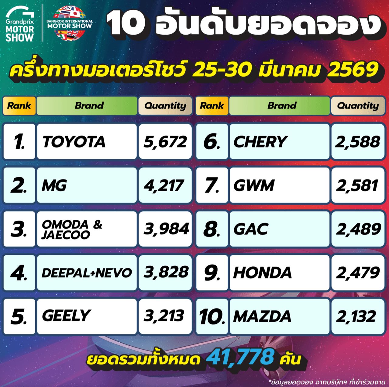 ยอดจองรถยนต์ในช่วง 7 วันแรกของงาน Bangkok International Motor Show 2026 ครั้งที่ 47 ถือว่าคึกคักอย่างมาก ด้วยตัวเลขรวมกว่า 41,778 คัน สะท้อนถึงการแข่งขันที่ดุเดือด โดยเฉพาะกลุ่มรถยนต์ไฟฟ้า (EV) ที่ขยับขึ้นมาครองพื้นที่ยอดจองภายในงานอย่างชัดเจน งานนี้ Mazda ยักษ์หลับ สะดุ้งตื่นขึ้นทันทีทันควัน ด้วยยอดจอง 2,000 คัน เหนาะๆ งานนี้ แจ้งเกิดใหม่กับรถไฟฟ้า และเตรียมตัวเปิดรถครอสโอเวอร์ไฟฟ้ารุ่นใหม่ CX-6e ในช่วงปลายปี สานต่อความสำเร็จของ Mazda 6e