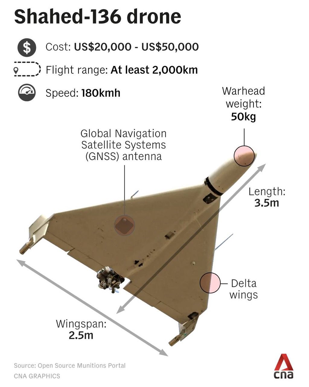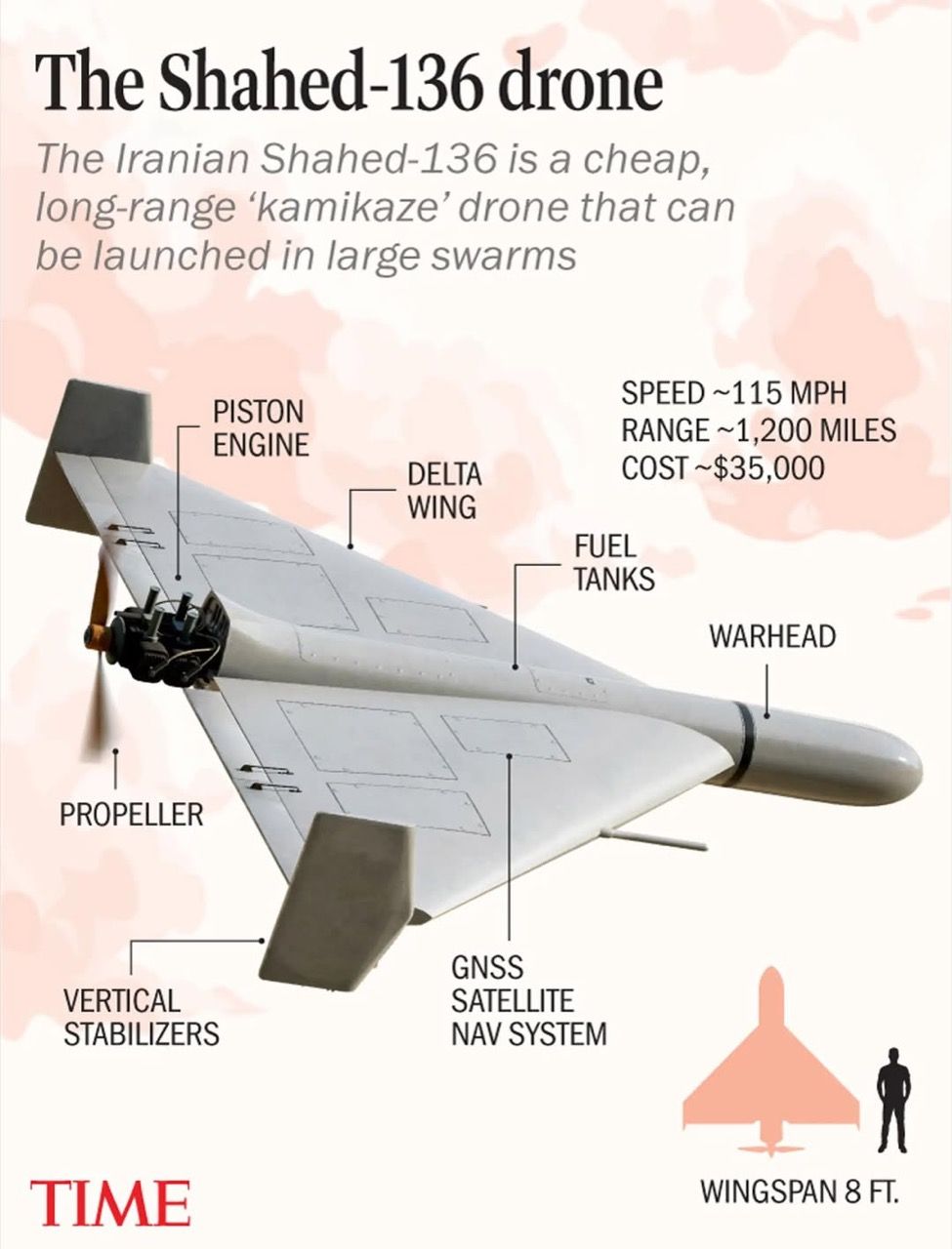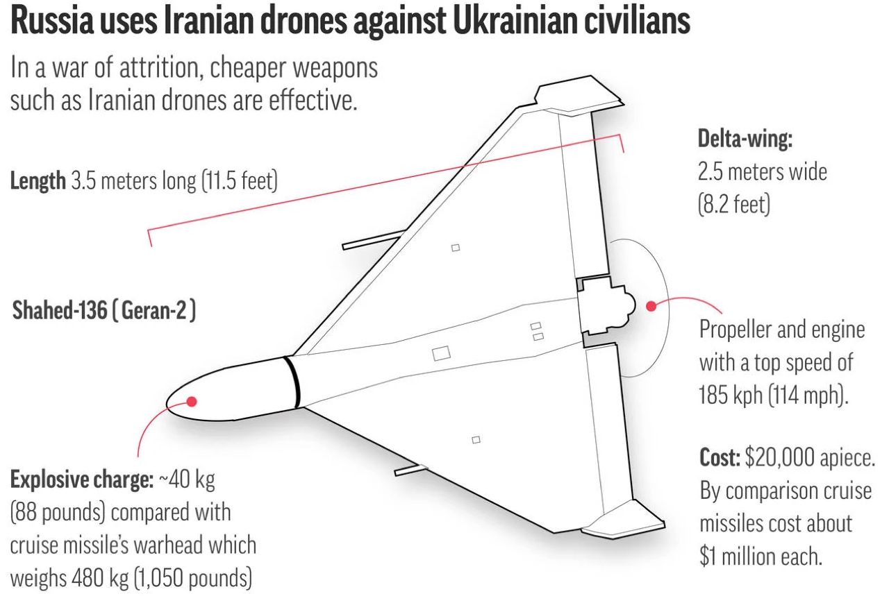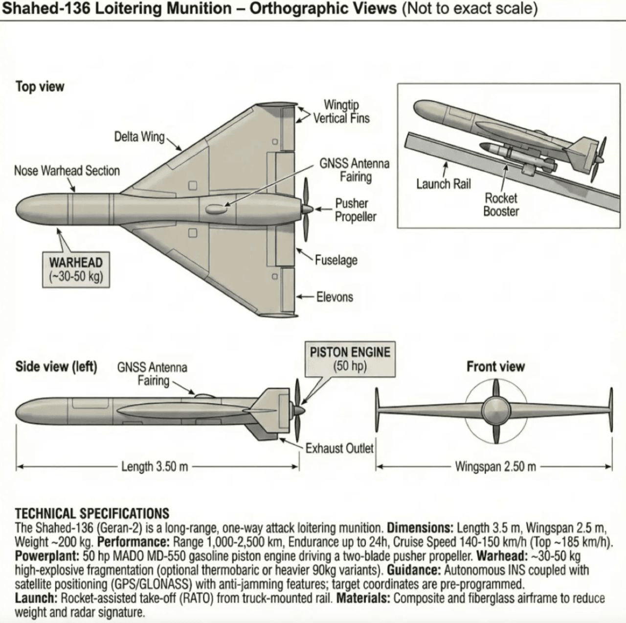 เครื่องยนต์ของโดรน Shahed ใช้เครื่องยนต์ลูกสูบ 2 จังหวะขนาดเล็ก เป็นเครื่องยนต์ที่หาได้ในตลาดพลเรือนทั่วไป การนำร่องหรือระบบนำทางของโดรนรุ่นนี้ สามารถพัฒนาต่อยอดได้เลย จากอุตสาหกรรมระบบนำทาง (Navigation) ที่มีการใช้งานอย่างแพร่หลาย การใช้ GPS/GNSS ร่วมกับระบบ Inertial Navigation System (INS) ราคาประหยัด เป็นเทคโนโลยีที่หาซื้อได้ทั่วไป (Off-the-shelf) แม้จะถูกรบกวนสัญญาณได้ง่าย แต่ก็เพียงพอสำหรับภารกิจแบบพลีชีพ