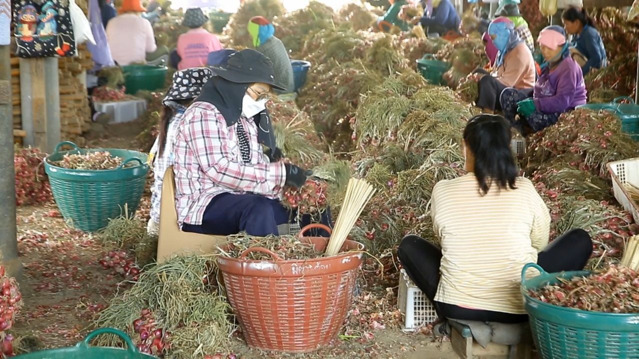 ถามนางอัญชลี จินาต้าว ชาวบ้านป่าดำ ต.บ้านโฮ่ง อ.บ้านโฮ่ง จ.ลำพูน ซึ่งเป็นชาวสวนหอมแดง และยังเป็นแม่ค้ารับซื้อหอมแดง ได้นำผู้สื่อข่าวไปดูคนงานกว่า 80 คนที่เป็นชาวบ้าน กำลังเร่งตัดแต่งหัวหอมแดง ซึ่งมีจำนวนมากที่กองอยู่เต็มบริเวณโกดัง