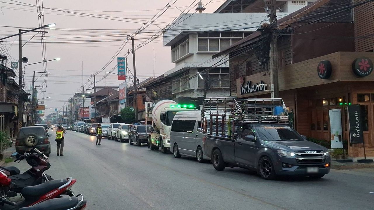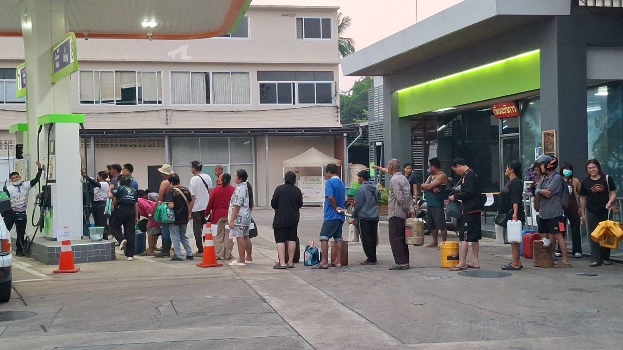 สุโขทัย ชาวบ้านต่อคิวยืนถือแกลลอน รอซื้อน้ำมันดีเซล ตั้งแต่ปั๊มน้ำมันยังไม่เปิด เจ้าหน้าที่ตำรวจจราจร สภ.สวรรคโลก ต้องมาอำนวยความสะดวกการจราจร