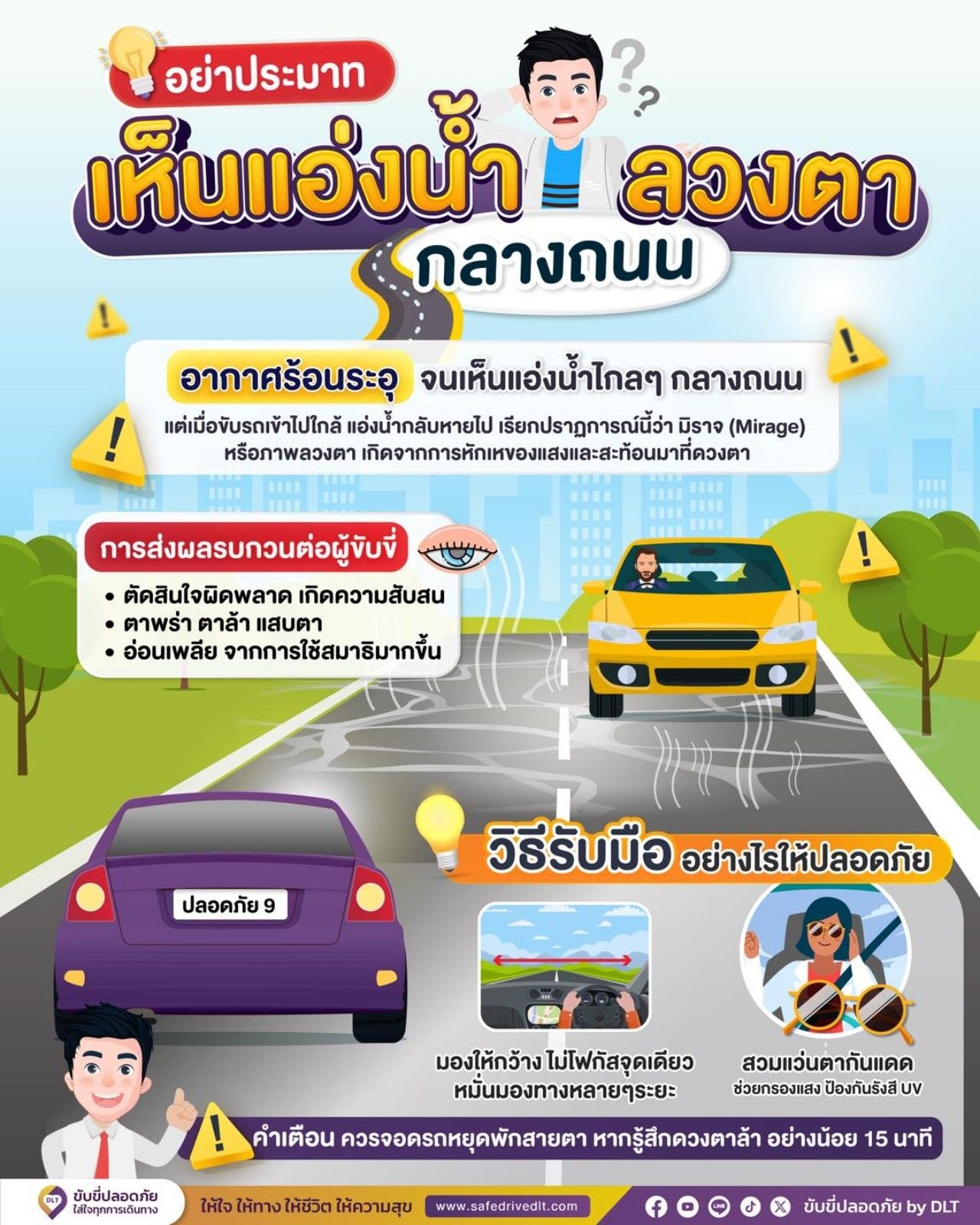 สำหรับวิธีรับมือขับรถตอนหน้าร้อนต้องระวัง รับมืออย่างมีสติ มองถนนให้กว้าง ไม่โฟกัสจุดเดียว สวมแว่นตากันแดดช่วยกรองแสง เพื่อช่วยลดภาระการทำงานของดวงตาอีกด้วย ที่สำคัญควรจอดหยุดพักสายตา หากรู้สึกดวงตาล้าอย่างน้อย 15 นาที