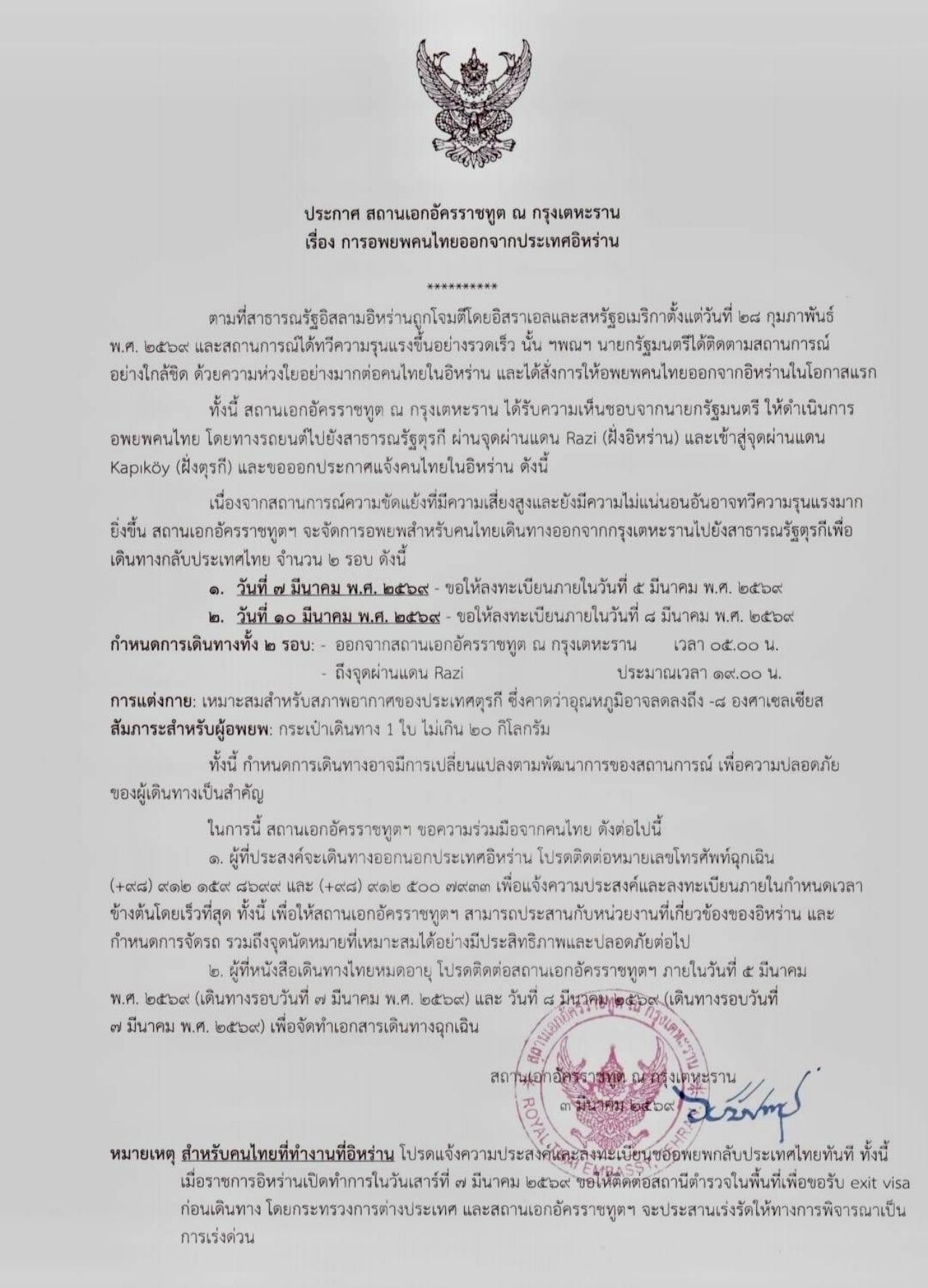 สำหรับคนไทยที่ทำงานที่อิหร่าน โปรดแจ้งความประสงค์และลงทะเบียนขออพยพกลับประเทศไทยทันที เมื่อราชการอิหร่านเปิดทำการในวันเสาร์ที่ 7 มีนาคม 2569 รวมทั้งขอให้ติดต่อสถานีตำรวจในพื้นที่เพื่อขอรับ exit visa ก่อนเดินทาง โดยกระทรวงการต่างประเทศ และสถานเอกอัครราชทูตฯ จะประสานเร่งรัดให้ทางการพิจารณาเป็นการเร่งด่วน.