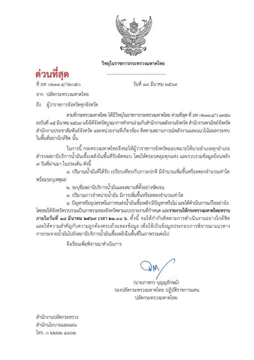 กระทรวงมหาดไทยสั่งการด่วนที่สุดไปยัง ผวจ.- นายอำเภอทั่วประเทศ เร่งสำรวจสถานการณ์พลังงานเชื้อเพลิงย้อนหลัง 7 วันถึงปัจจุบัน เพื่อพิจารณาแนวทางการกระจายน้ำมันไปยังสถานีบริการในพื้นที่