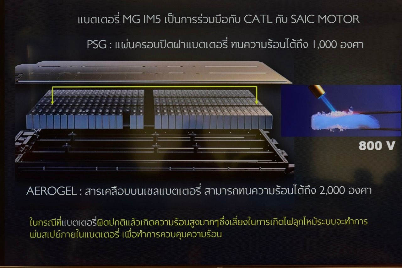 เทคโนโลยีแบตเตอรี่และโครงสร้าง (Cell-to-Pack) ความปลอดภัยและหนาแน่นของพลังงาน MG IM5 ใช้แบตเตอรี่เทคโนโลยี Cell-to-Pack (CTP) ลดจำนวนชิ้นส่วนภายในแพ็ก ทำให้มีพื้นที่ว่างสำหรับเซลล์แบตเตอรี่มากขึ้น ได้ความจุที่สูงขึ้น ในขนาดกะทัดรัด วัสดุฉนวน Aerogel แบตเตอรี่ถูกป้องกันด้วยวัสดุฉนวน Aerogel ที่ทนความร้อนได้สูงถึง 1,000 องศาเซลเซียส ช่วยเพิ่มมาตรฐานความปลอดภัยขั้นสูงสุดให้กับระบบจัดการพลังงาน