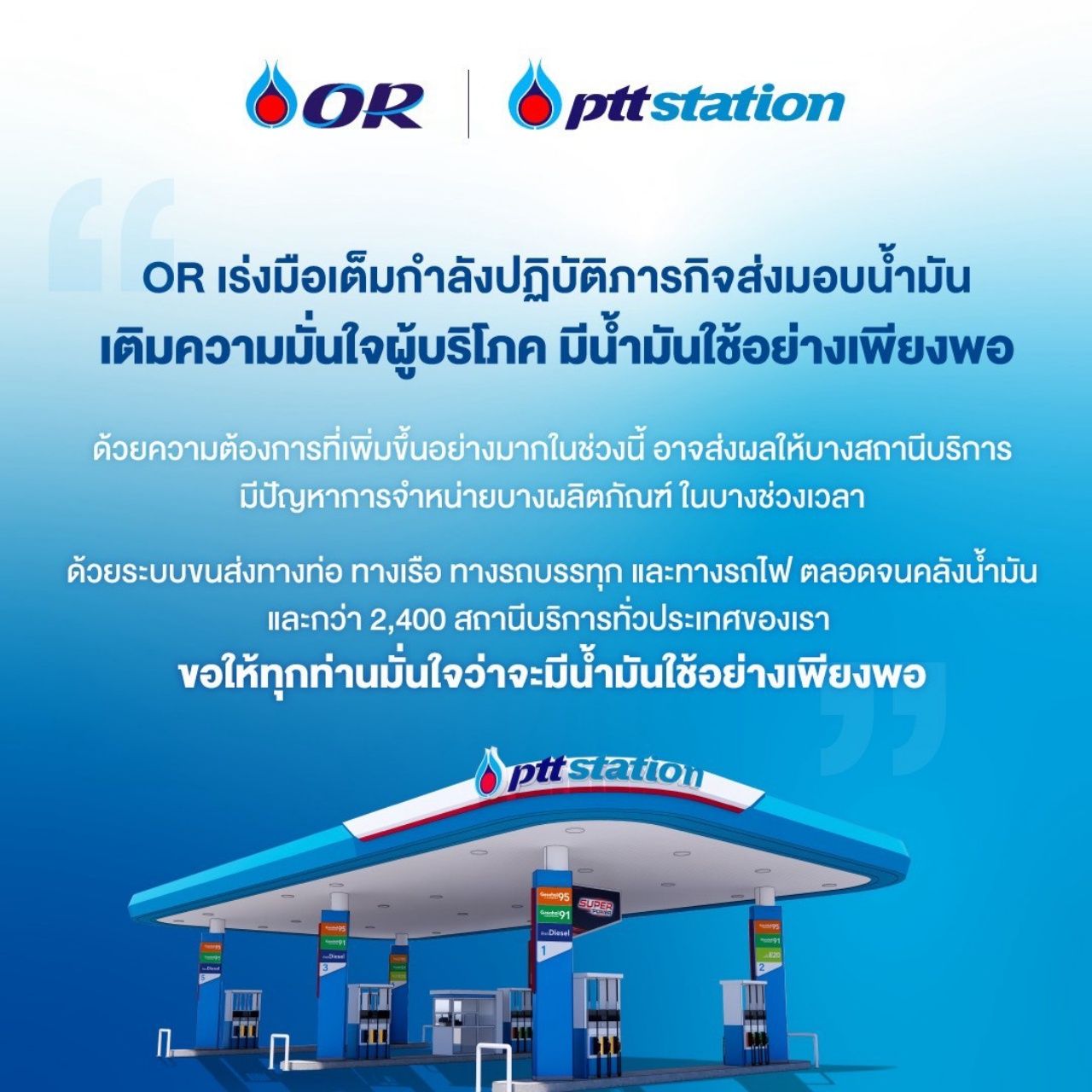 อย่างไรก็ตาม ด้วยความต้องการใช้น้ำมันที่เพิ่มขึ้นอย่างมากในช่วงนี้ อาจส่งผลให้บางสถานีบริการมีปัญหาการจำหน่ายบางผลิตภัณฑ์ในบางช่วงเวลา เนื่องจากต้องรอการขนส่งมาจากคลังของเรา แต่ยังคงยืนยันน้ำมันไม่ขาดแน่นอนครับ ทั้ง OR ได้พยายามอย่างเต็มที่เพื่อบริหารจัดการและลดผลกระทบให้มากที่สุด