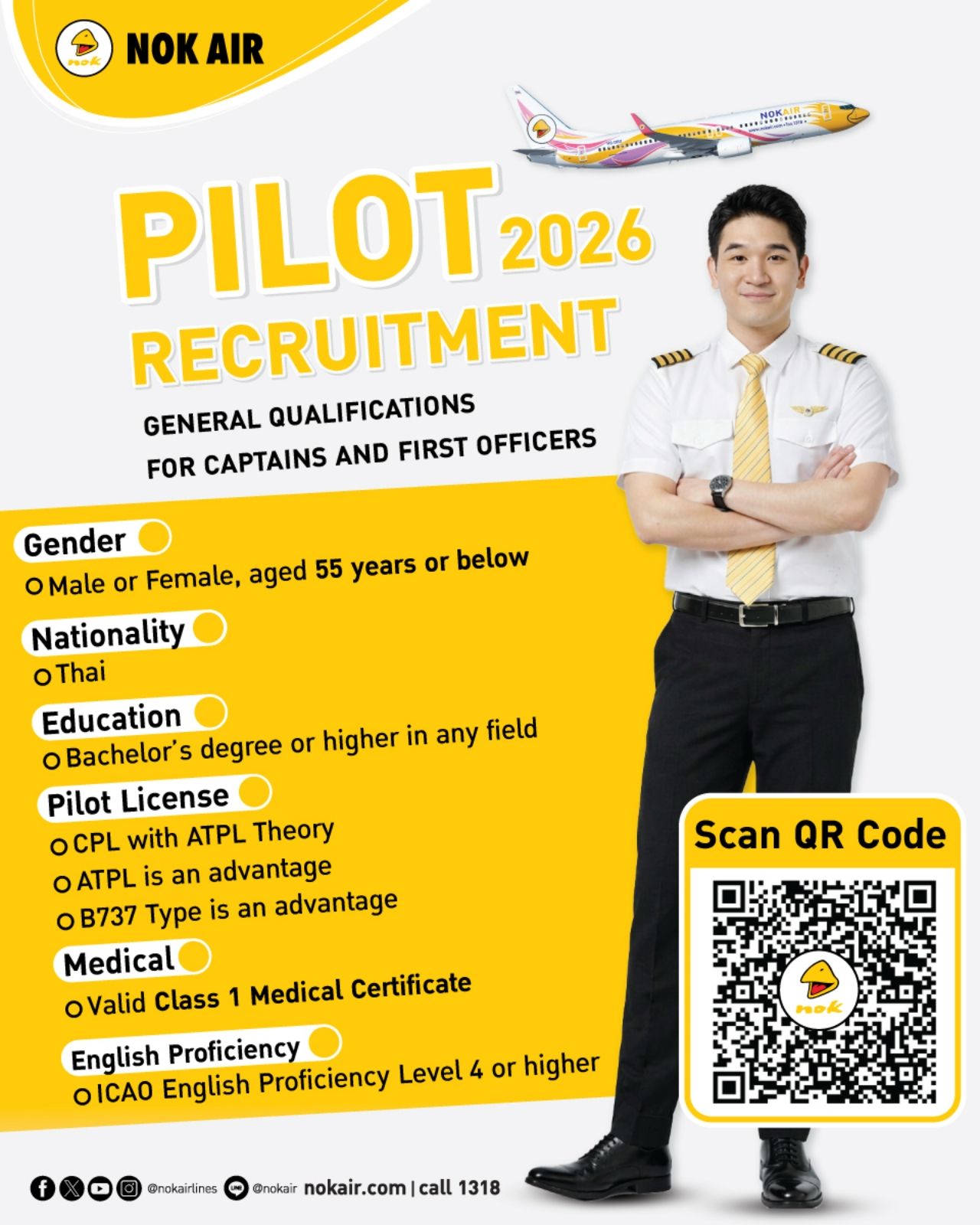 ขณะที่ บริษัท สายการบินนกแอร์ จำกัด (มหาชน) เปิดรับสมัครนักบิน เพื่อร่วมเป็นกำลังสำคัญในการขับเคลื่อนองค์กร โดยผู้ที่สนใจสามารถศึกษารายละเอียดและสมัครผ่านลิงก์ด้านล่างโดยยังไม่ต้องแนบเอกสารในขั้นตอนแรกของการสมัคร เปิดรับสมัครถึงวันที่ 8 มีนาคม 2569 สมัครได้ที่นี่ คลิก