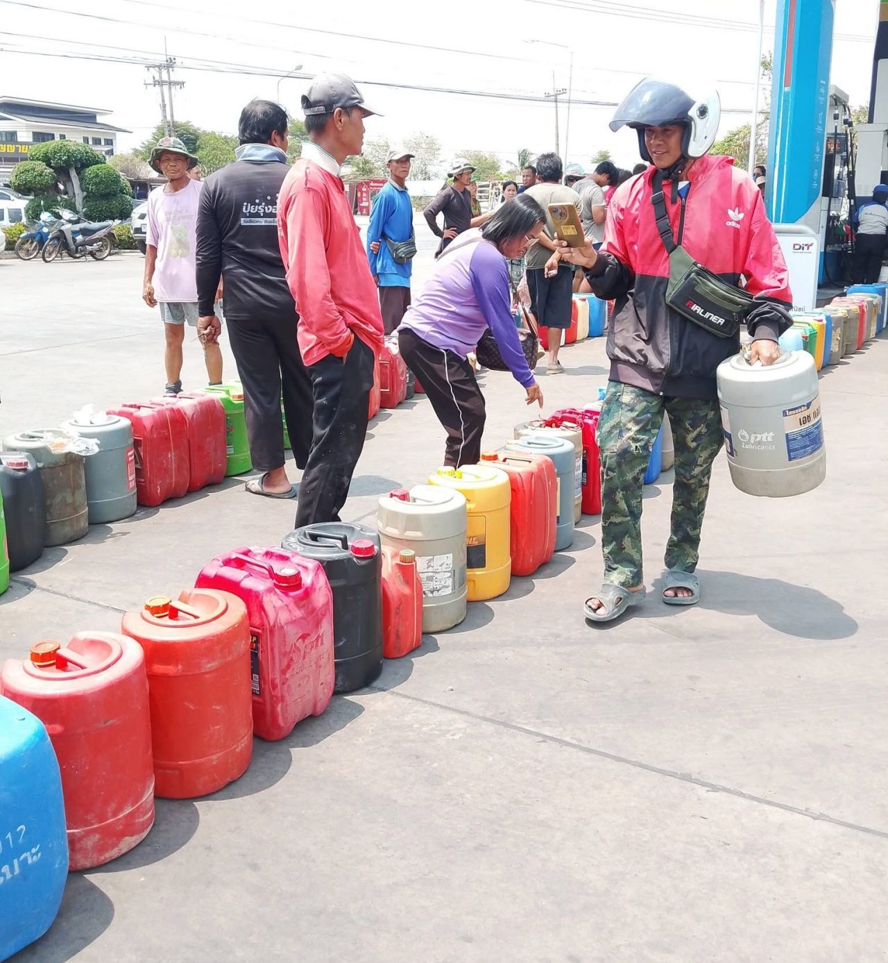 เป็นที่ต้องการอย่างมาก ชาวบ้านที่จังหวัดร้อยเอ็ด หิ้วแกลลอนมาต่อคิวยาวเหยียด เพื่อรอเติม "น้ำมัน" กันเป็นจำนวนมาก