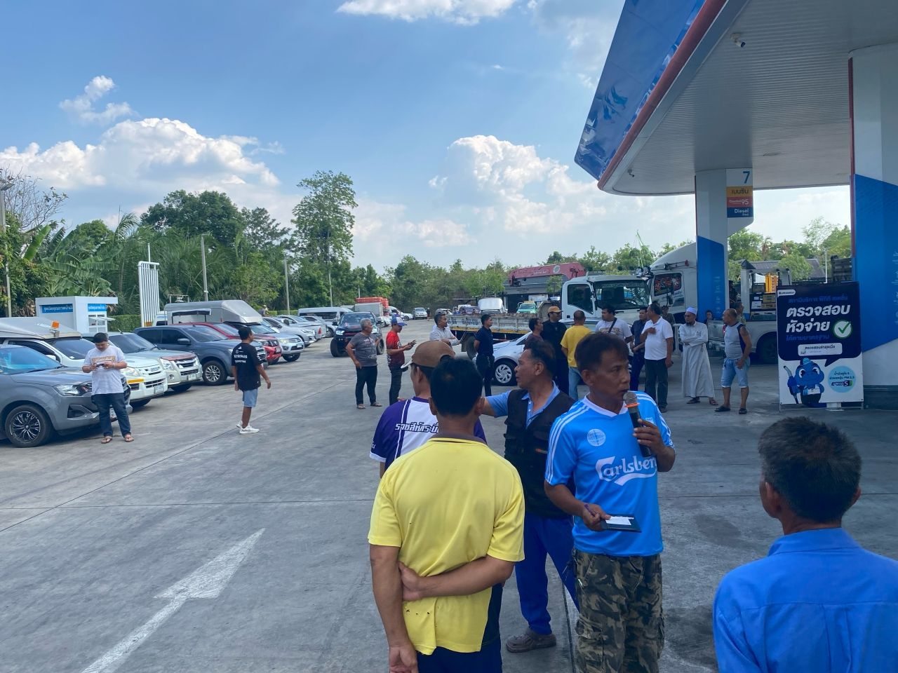 อย่างพนักงานขับรถขนส่งสินค้าเอกชนรายหนึ่ง มารอคิวเติมน้ำมันตั้งแต่ช่วงเช้า จอดรอจนน้ำมันรถหมด ต้องใช้แกลลอนไปซื้อน้ำมันมาเติมในราคา 900 บาท เผยว่า ทุกวันนี้การวิ่งส่งสินค้าต้องล่าช้าออกไปมาก เพราะแต่ละวันต้องมารอคิวเติมน้ำมัน อย่างวันนี้ ตนมารอแต่เช้า กว่าจะได้เติมก็บ่าย 3 ยังไม่ได้วิ่งส่งสินค้าให้ลูกค้าเลยแม้แต่รายเดียว หากจะหวังไปเติมน้ำมันข้างหน้า ก็หวังไม่ได้ เพราะทุกแห่งเจอปัญหานี้หมด แต่ยังดีที่ลูกค้าเข้าใจสถานการณ์ดี อยากให้รัฐบาลเร่งจัดการปัญหาโดยเร็ว เพราะชาวบ้านกำลังเดือดร้อนอย่างหนัก