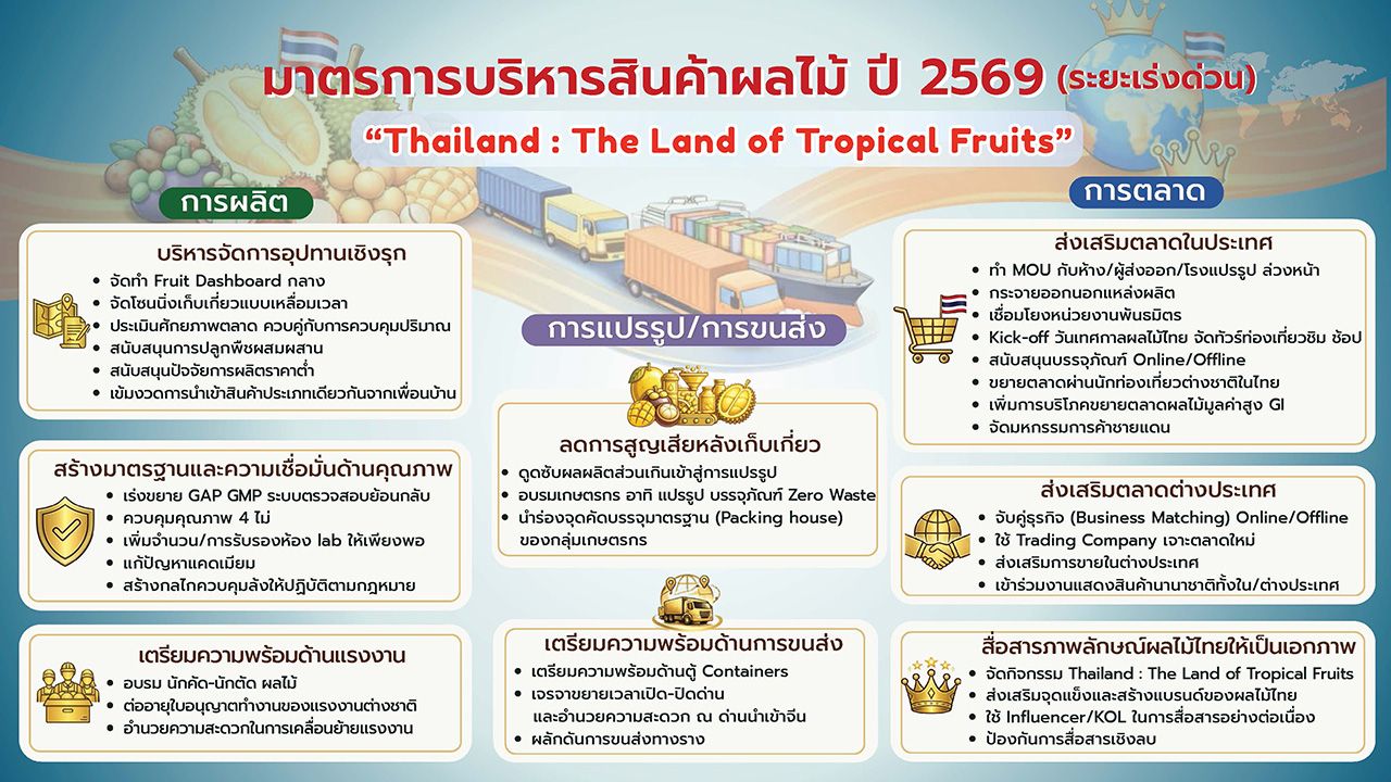สำหรับมาตรการที่จะดำเนินการรองรับทุเรียน เช่น เร่งตรวจรับรองมาตรฐานจีเอพี, การคุมเข้มสารตกค้างบีวายทู, เตรียมแรงงานเก็บผลไม้ ที่ได้ฝึกอบรมทักษะการตัด การคัดแยกแล้ว, การจัดเตรียมตู้คอนเทนเนอร์สำหรับส่งออก และเพิ่มการส่งออกทางรางเพิ่มเติมจากเดิมทางบก และทางเรือ นอกจากนี้ ได้เตรียมเจรจาด่านนำเข้าต่างๆ เพื่ออำนวยความสะดวกให้กับการส่งออกผลไม้ไทย และผู้ซื้อจากในประเทศทั้งตลาดสด ห้างโมเดิร์นเทรด และเตรียมเชิญนายอนุทิน ชาญวีรกูล นายกรัฐมนตรี เป็นประธานคิกออฟเทศกาลทุเรียนไทย ช่วงปลายเดือนมี.ค.หรือต้นเดือน เม.ย.69 ตลอดจนจับมือกับการท่องเที่ยวแห่งประเทศไทย เร่งโปรโมตผลให้นักท่องเที่ยว