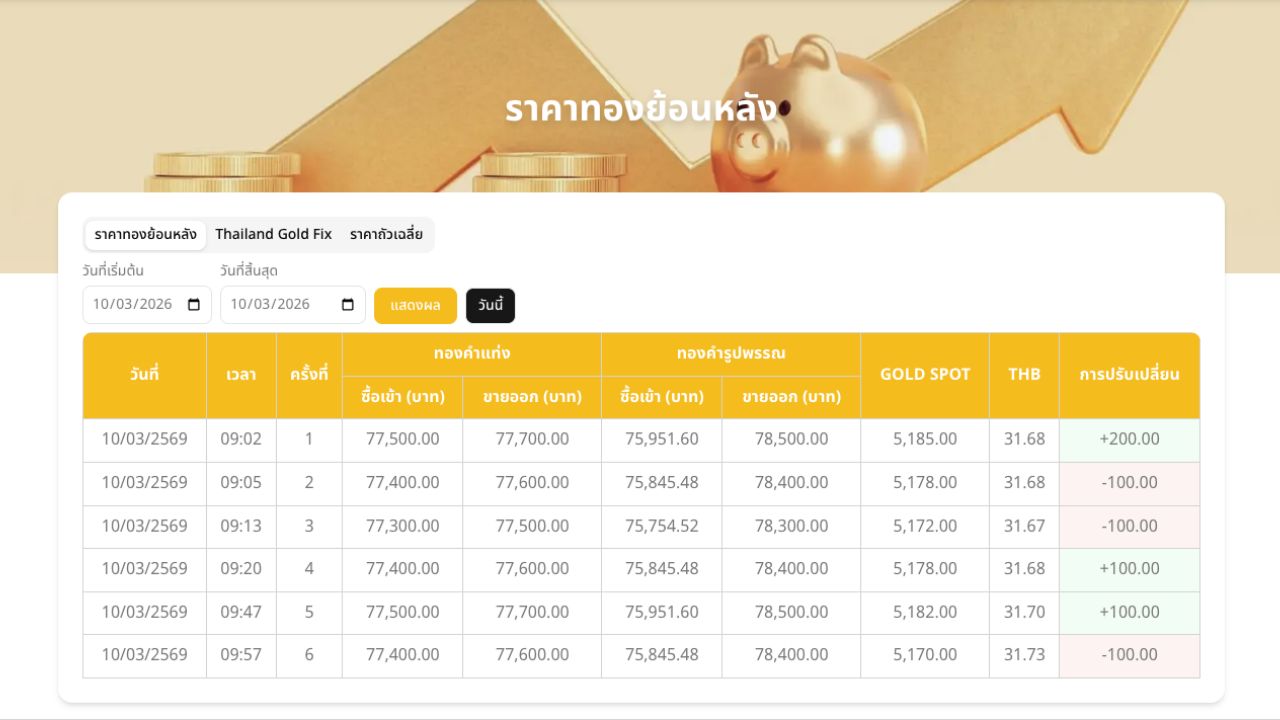 วันที่ 10 มีนาคม 2569 สมาคมค้าทองคำรายงานว่า "ราคาทองไทยวันนี้" ครั้งที่ 1 เมื่อเวลา 09.02 น. ราคาปรับเพิ่มขึ้น 200 บาท ส่งผลให้ "ราคาทองคำแท่ง" รับซื้อบาทละ 77,500 บาท ขายออกบาทละ 77,700 บาท ส่วน "ราคาทองรูปพรรณ" รับซื้อบาทละ 75,951.60 บาท ขายออกบาทละ 78,500 บาท เช็กราคาทองคำวันนี้ ดังนี้