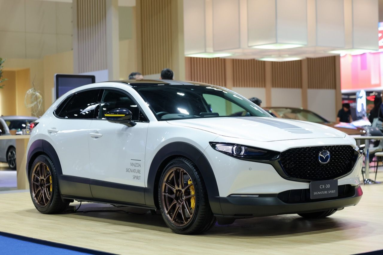 MAZDA นำยนตรกรรม New Mazda CX-30 Signature Spirit รุ่นตกแต่งพิเศษ ที่ถ่ายทอดจิตวิญญาณความสปอร์ต สะท้อนตัวตนผ่านดีไซน์และสมรรถนะความสปอร์ต มาจัดแสดงภายในงาน เพื่อสร้างแรงบันดาลใจให้กับลูกค้าที่ชื่นชอบการแต่งรถ ควบคู่กับการนำรถยนต์ทุกรุ่น ทั้งรถยนต์นั่ง ครอสโอเวอร์เอสยูวี CX-Series และ ปิกอัพ มาจัดแสดง พร้อมมอบแคมเปญพิเศษมากมาย ทั้งส่วนลดสูงสุด 130,000 บาท ดอกเบี้ยต่ำสุด 0% นานสูงสุด 60 เดือน ฟรีประกันภัยชั้น 1 ฟรีโปรแกรมคุ้มครองและดูแลรถ Mazda Ultimate Service (MUS) นานสูงสุด 7 ปี ฟรีขยายการรับประกันคุณภาพเป็น 5 ปี หรือ 150,000 กม. ฟรีของพรีเมี่ยมสุดพิเศษจาก MAZDA พิเศษสำหรับลูกค้า Mazda Family และครอบครัว MAZDA ยังมอบบัตรน้ำมันมูลค่าสูงสุดอีก 20,000 บาท