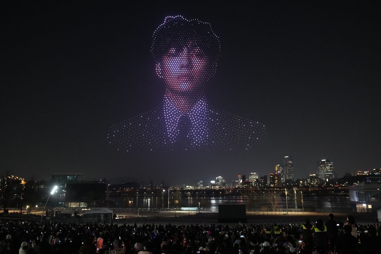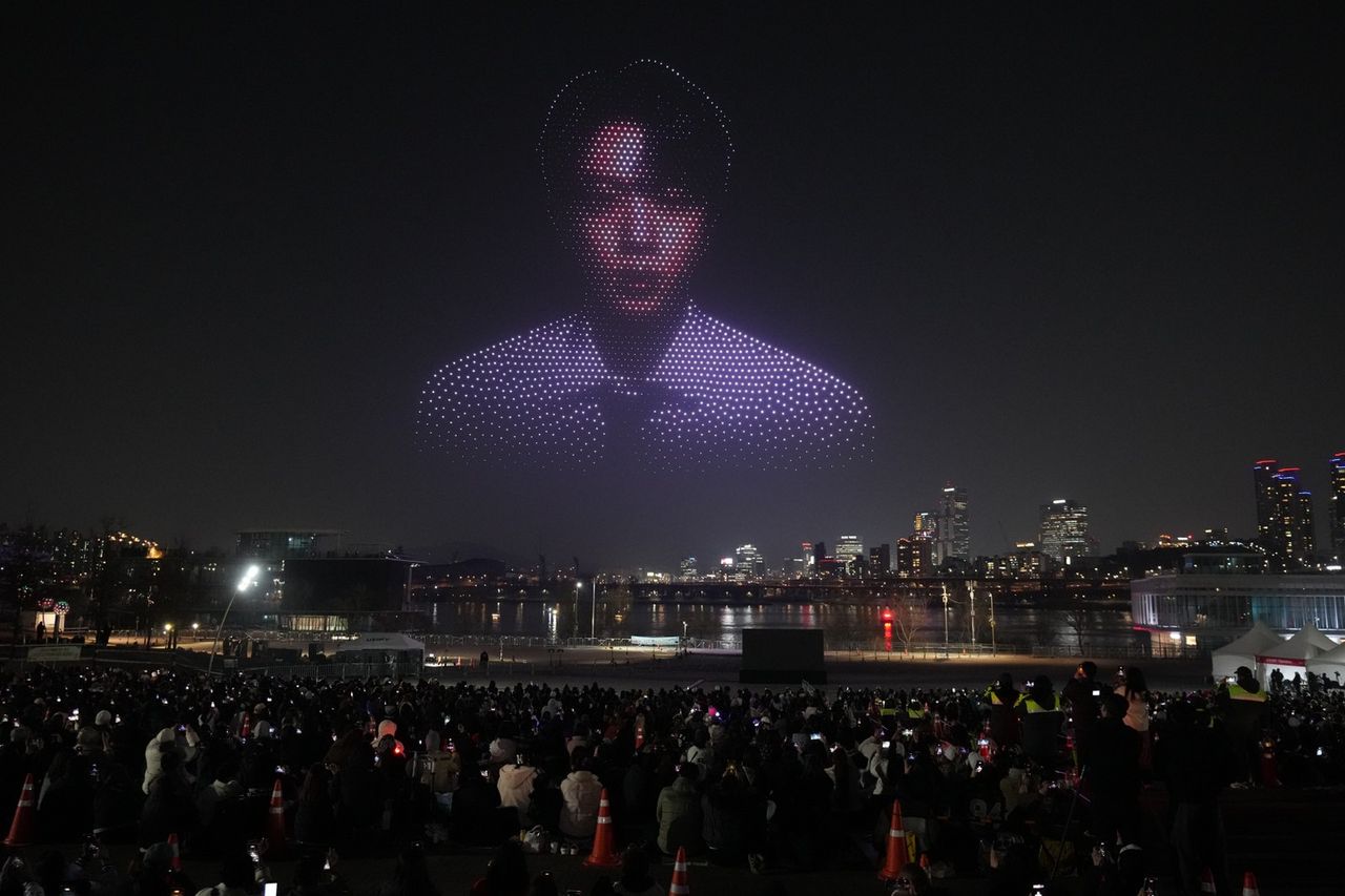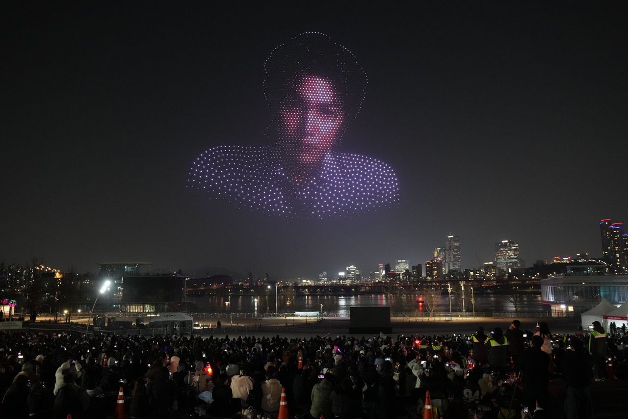 โดรนจำนวนราว 2,000 ตัว พุ่งขึ้นสู่ท้องฟ้ายามค่ำคืนในกรุง โซล ประเทศเกาหลีใต้ ก่อนจะเรียงตัวเป็นใบหน้าของสมาชิกวง BTS อย่างสวยงาม ท่ามกลางแฟนคลับนับร้อยส่งเสียงเชียร์กึกก้อง