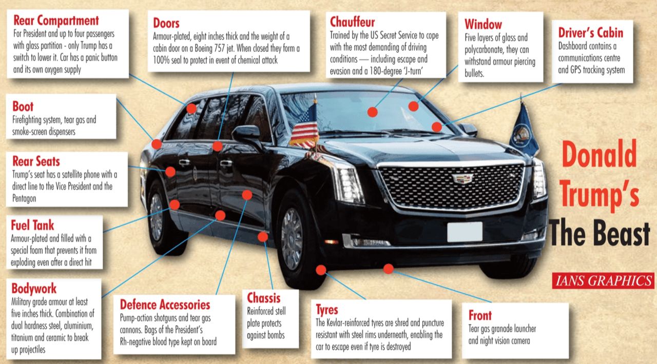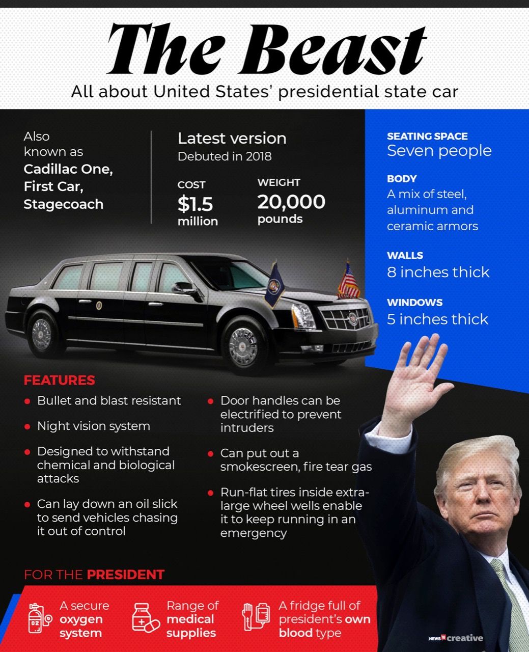 รถยนต์ประจำตำแหน่งประธานาธิบดีสหรัฐฯ หรือที่รู้จักกันในชื่อเล่นว่า "The Beast" (เดอะ บีสต์) ไม่ใช่รถยนต์ที่ผลิตออกมาขายทั่วไป แต่เป็นยานพาหนะที่สร้างขึ้นตามความต้องการเฉพาะของหน่วยอารักขาประธานาธิบดี (U.S. Secret Service) โดย General Motors (GM) เนื่องจากเป็นรถที่มีความสำคัญสูงสุด ข้อมูลทางเทคนิคที่แน่ชัดจึงถูกจัดเป็น ข้อมูลลับทางราชการ อย่างไรก็ตาม จากการวิเคราะห์และข้อมูลที่เปิดเผยออกมา นี่คือรายละเอียดโดยประมาณของ "The Beast" รุ่นที่เริ่มใช้งานในปี 2018 (ซึ่งประธานาธิบดีโดนัลด์ ทรัมป์ ได้ใช้ในช่วงสมัยแรก)