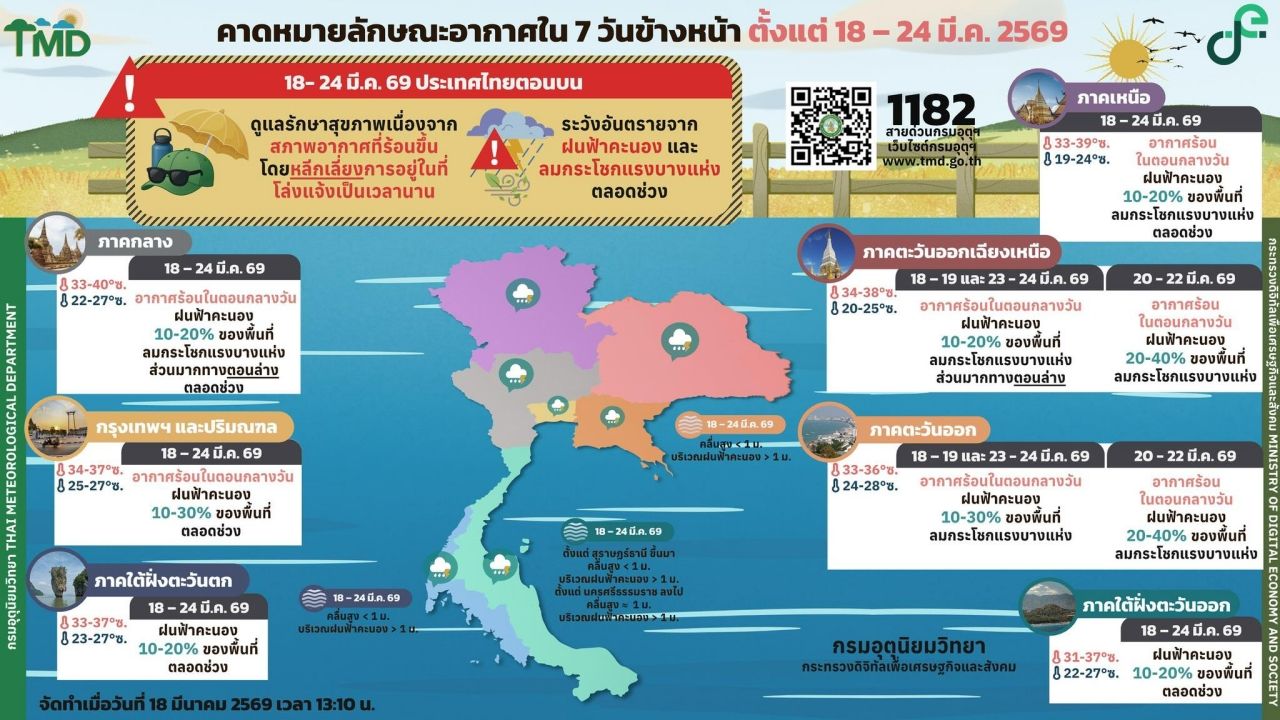 กรมอุตุนิยมวิทยา คาดหมายลักษณะอากาศ 7 วันข้างหน้า ระหว่างวันที่ 18 - 24 มี.ค. 2569 ระบุว่า ประเทศไทยตอนบน มีอากาศร้อนขึ้น แต่บางพื้นที่ระวังฝนตกหนัก ลมกระโชกแรง