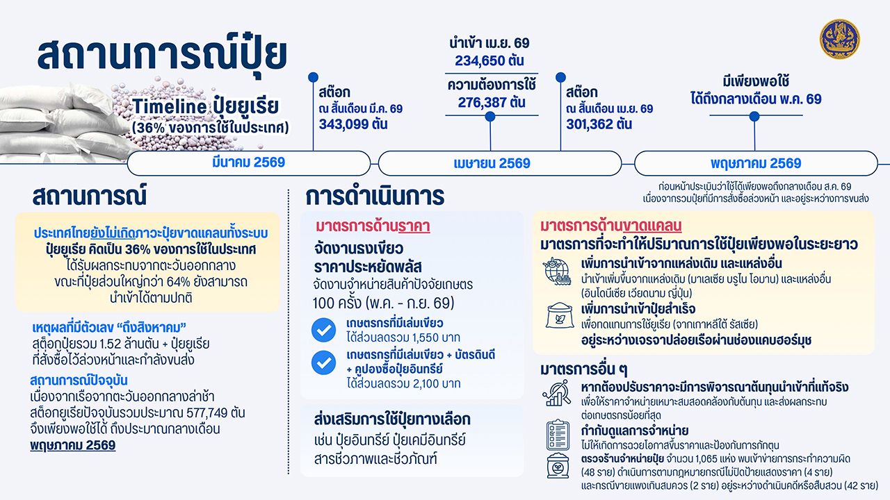 ปัจจุบันมีสต๊อกปุ๋ยรวมประมาณ 900,000 ตัน โดยเป็นปุ๋ยยูเรียประมาณ 343,000 ตัน และมีแผนนำเข้าเพิ่มเติมอีก 234,650 ตัน เพื่อรองรับฤดูกาลเพาะปลูก พร้อมทั้งส่งเสริมให้ใช้ปุ๋ยสูตรผสม เช่น 40-0-0, 21-0-0, 18-8-8 เป็นต้น เพื่อลดการพึ่งพายูเรียล้วน และลดความเสี่ยงด้านราคา รวมถึงดำเนินโครงการ “ธงเขียวพลัส” เพิ่มส่วนลดให้เกษตรกรจาก 200 เป็น 300 บาทต่อราย พร้อมสิทธิประโยชน์เพิ่มเติม