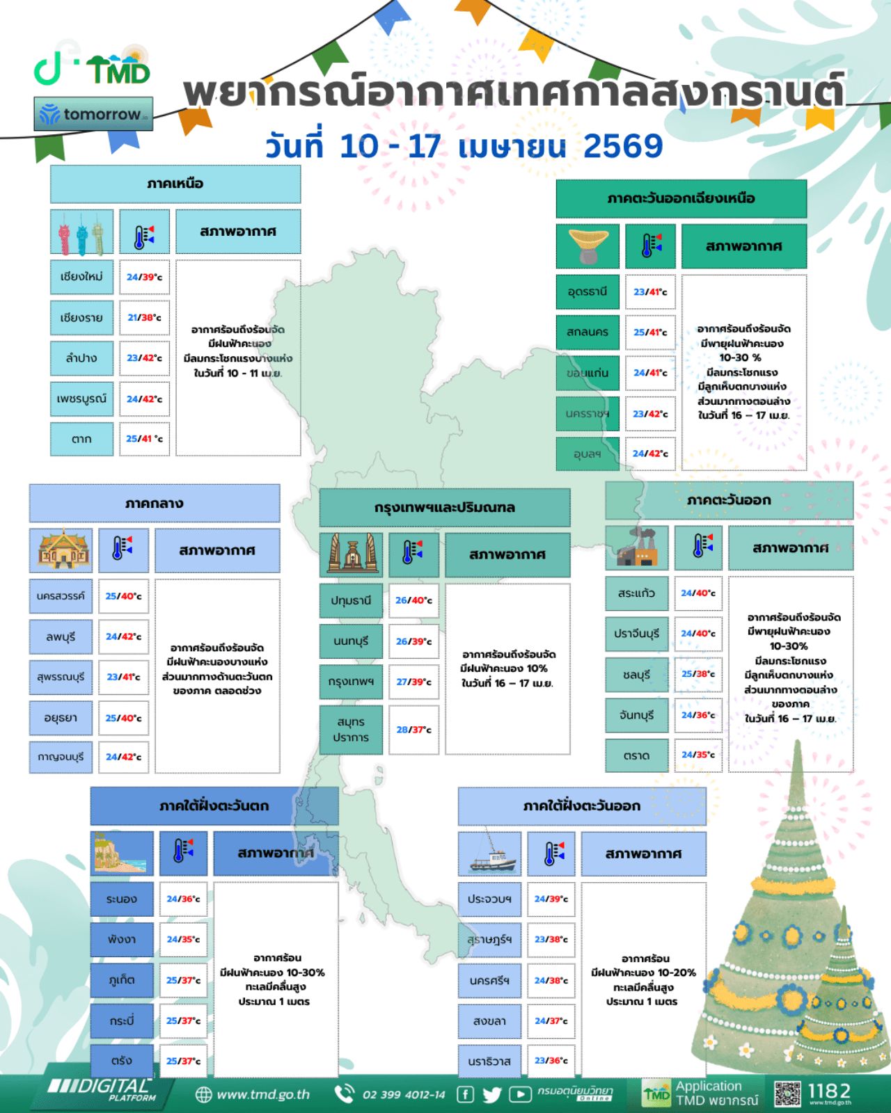 วันที่ 11 เม.ย. 69 กรมอุตุนิยมวิทยา พยากรณ์อากาศเทศกาลสงกรานต์ 2569 ระบุว่า ในช่วงวันที่ 10-17 เม.ย. 69 ประเทศไทยมีอากาศร้อนถึงร้อนจัดโดยทั่วไป กับมีฟ้าหลัวในตอนกลางวัน โดยมีฝนฟ้าคะนองบางพื้นที่ เนื่องจากความกดอากาศต่ำเนื่องจากความร้อนปกคลุมประเทศไทยตอนบน ในขณะที่ลมตะวันตกเฉียงใต้กำลังอ่อนพัดปกคลุมประเทศไทย