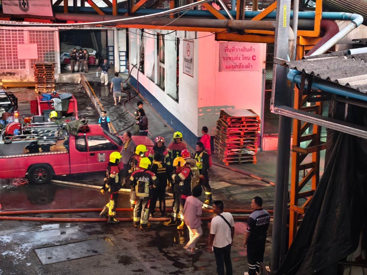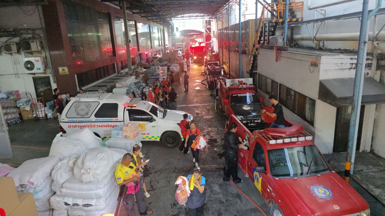ที่เกิดเหตุพบรถน้ำดับเพลิงระดมฉีดน้ำเพื่อสกัดดับไฟที่กำลังลุกไหม้ในโกดังซึ่งเป็นอาคารสูง 4 ชั้น เนื้อที่เกือบ 3 ไร่ โดยเป็นโกดังเก็บสต็อกผ้าขนหนูจำนวนมาก จุดเกิดเหตุอยู่ที่ชั้น 2 ของอาคาร พนักงานบอกได้ยินเสียงระเบิดดังขึ้น และจากนั้นก็เกิดเปลวไฟขึ้นทันที พนักงานพยายามช่วยกันดับ แต่ไม่สามารถดับได้ เนื่องจากไฟลุกลามเร็วมาก ขณะเกิดเหตุมีพนักงานทำงานอยู่บริเวณจุดเกิดเหตุประมาณ 7-8 คน เวลาเกิดเหตุประมาณ 04.00 น. ทางเจ้าหน้าที่ป้องกันและบรรเทาสาธารณภัย อบต.ในคลองบางปลากด ร้องขอรถน้ำพื้นที่ใกล้เคียงสนับสนุน เนื่องจากไฟลุกไหม้ในตัวอาคาร และพื้นที่เกิดเหตุมีวัตถุไวไฟเช่นผ้าขนหนู อุปกรณ์แพ็กสินค้า จำนวนมาก