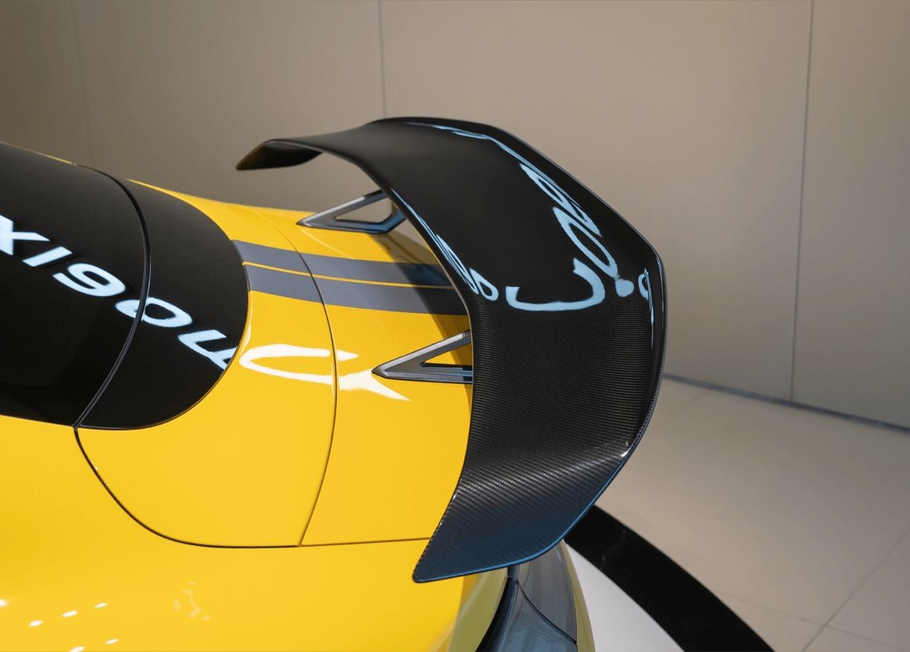 Fixed Carbon Fiber Rear Wing สปอยเลอร์หลังคาร์บอนไฟเบอร์ขนาดใหญ่ (ความกว้าง 1,560 มม.) ซึ่งเมื่อทำงานร่วมกับส่วนประกอบอื่น จะสร้างแรงกดมหาศาลถึง 285 กก. ช่วยให้รถนิ่งมากเมื่อเข้าโค้งด้วยความเร็วสูง