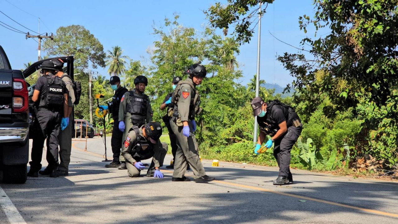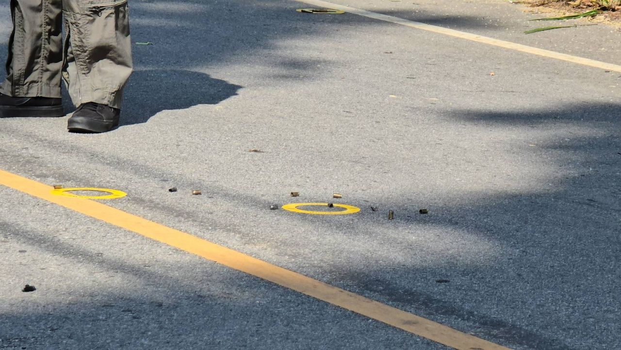 นราธิวาส - เจ้าหน้าที่สนธิกำลังเข้าตรวจสอบเหตุคนร้ายดักยิง “ปลัดอำเภอจะแนะ” เสียชีวิตพร้อมสาวที่นั่งมาด้วย คาดคนร้ายมี 2 กลุ่ม ทั้งซุ่มอยู่ในสวนผลไม้ อีกกลุ่มขี่รถจักรยานยนต์ติดตาม พฤติการณ์สุดโหดล้อมยิงจนรถพรุน พบปลอกกระสุน 4 ชนิดตกเกลื่อนพื้น รวม 68 ปลอก ชิงอาวุธปืนเอ็ม 16 ของทางราชการ หลบหนี