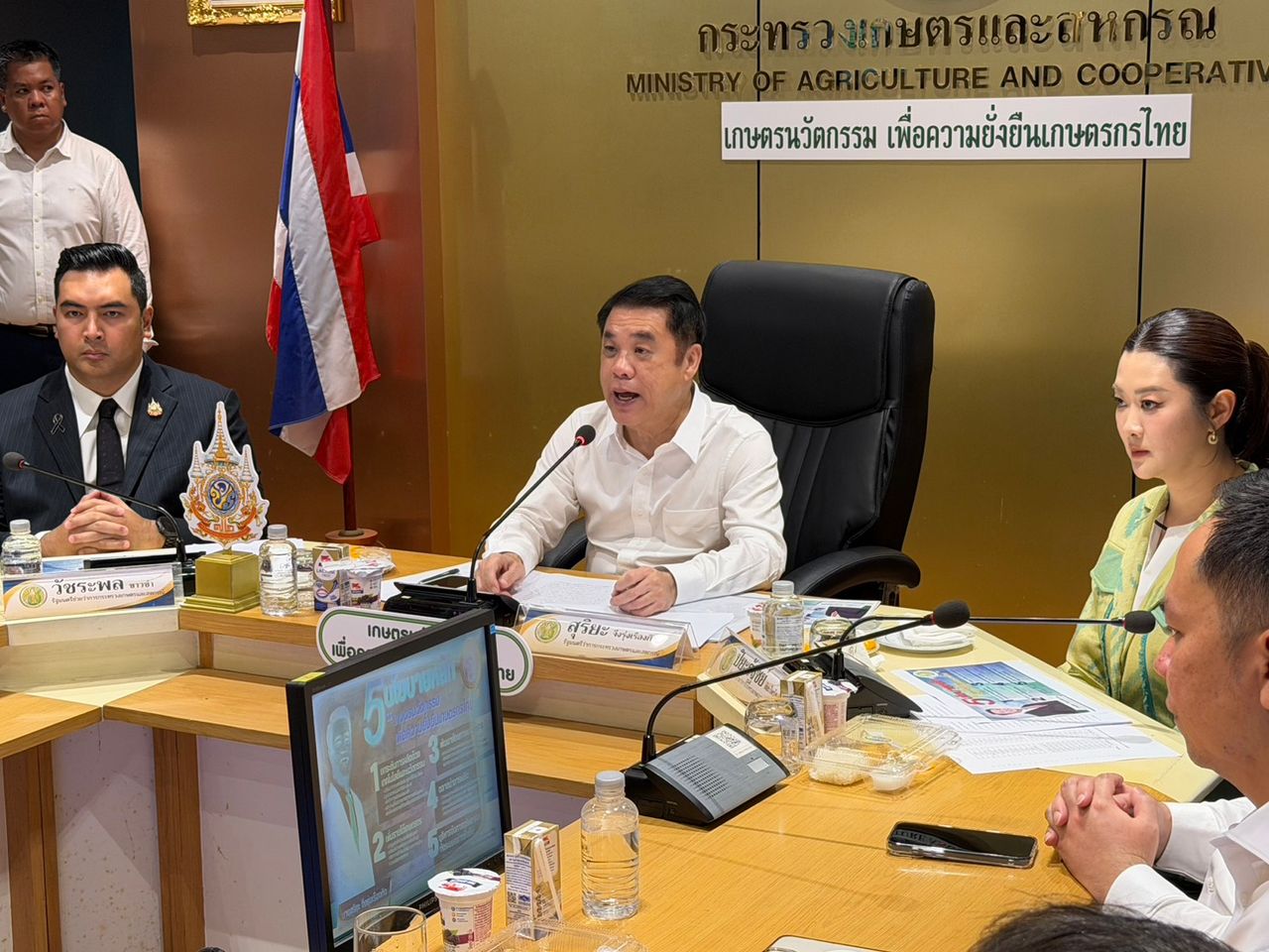 จากนั้นรัฐมนตรีว่าการกระทรวงเกษตรและสหกรณ์ เป็นประธานการประชุมผู้บริหารระดับสูงของกระทรวงเกษตรและสหกรณ์ เพื่อมอบนโยบายและแนวทางการขับเคลื่อนการดำเนินงาน เปิดเผยว่า จะจัดตั้งวอร์รูมเพื่อเร่งแก้ปัญหาเร่งด่วนให้พี่น้องเกษตรกร แบ่งออกเป็น 6 มาตรการ ได้แก่ มาตรการเพื่อรับมือสถานการณ์ตะวันออกกลาง เช่น การปรับสัดส่วนการใช้ปุ๋ยและส่งเสริมการใช้ปุ๋ยตามค่าวิเคราะห์ดินและความต้องการของพืช, การแก้ไขปัญหาน้ำมันเฉพาะรถขนส่งสินค้าเกษตร และใช้กลไก “ทูตเกษตร” หาตลาดกระจายสินค้าทดแทน, เร่งบริหารจัดการสินค้าเกษตรเพื่อการส่งออกและการบริโภคภายในประเทศ ทั้งการเร่งแก้ไขจุดคอขวดในการกระจายผลไม้ พร้อมทั้งพัฒนาระบบตรวจสอบย้อนกลับ รวมถึงการบริหารจัดการน้ำเพื่อการเกษตรและประชาชน, การบริหารจัดการดินและที่ดิน สร้าง Smart Farmer รุ่นใหม่ และการแก้ปัญหา PM 2.5 จะต้องเร่งติดตามและแก้ไขปัญหาอย่างเป็นระบบ โดยทุกหน่วยงานจะต้องรายงานผลอย่างต่อเนื่อง และที่สำคัญต้องเห็นผลที่เป็นรูปธรรม